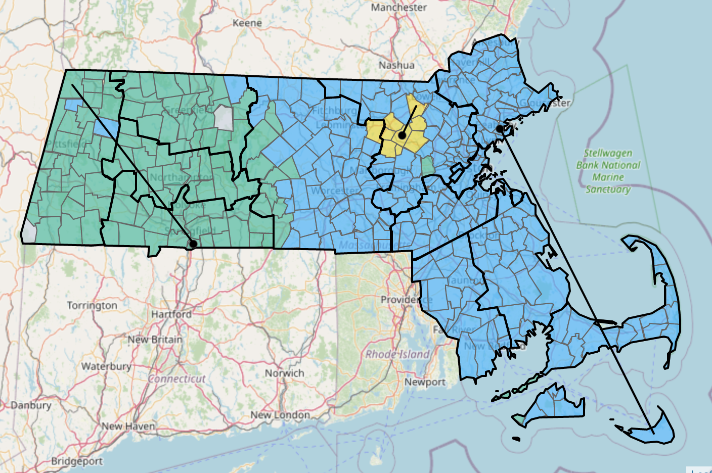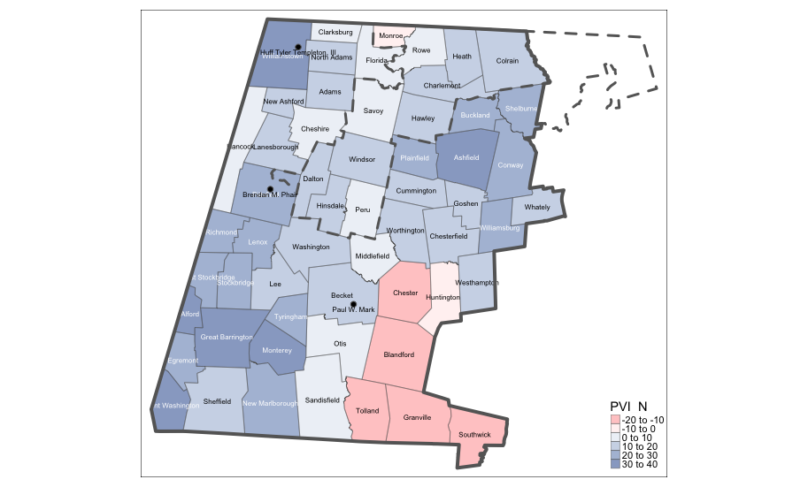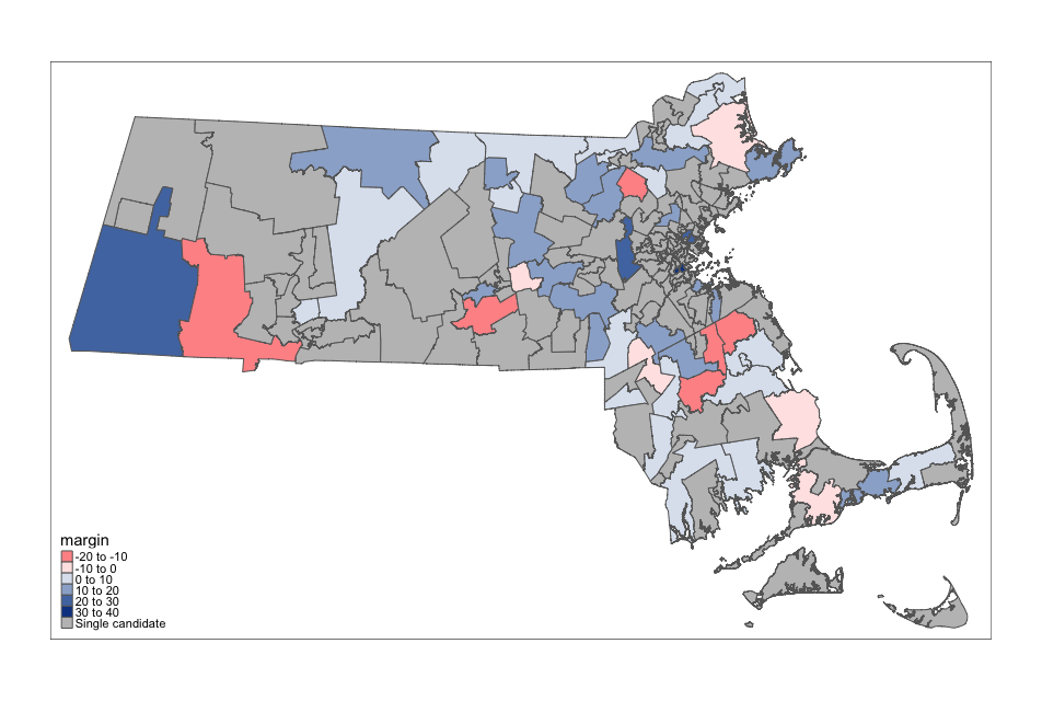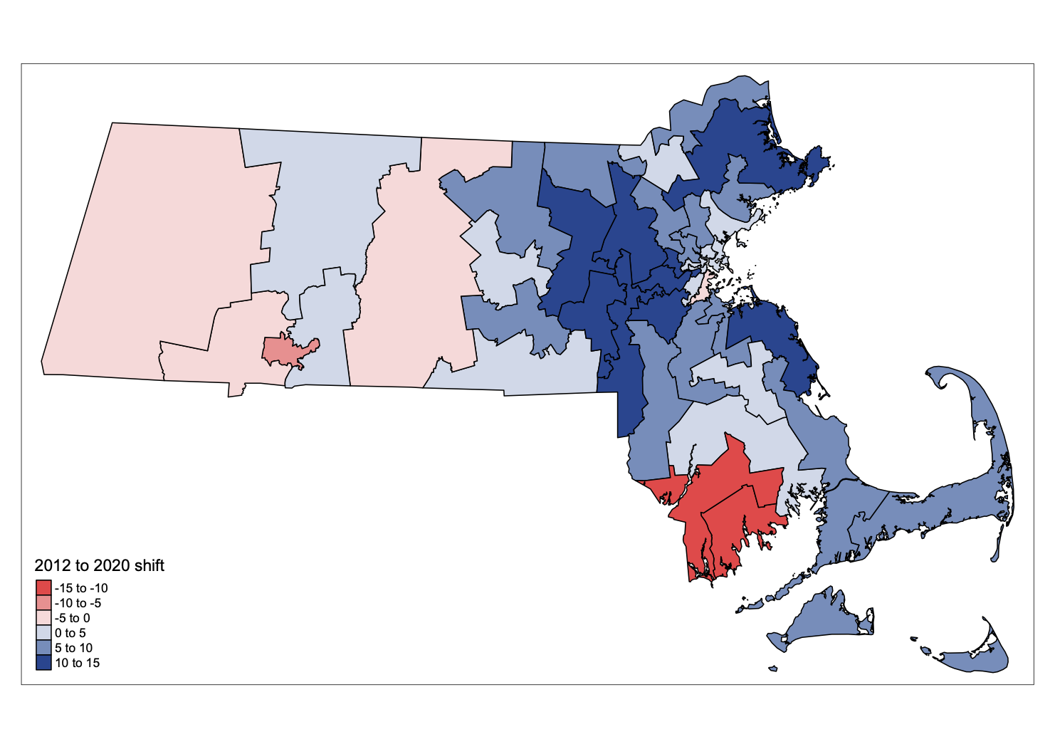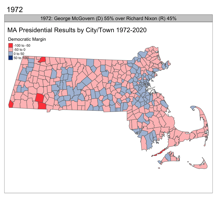 A municipality-based look at Massachusetts presidential voting from 1972 through 2020.
